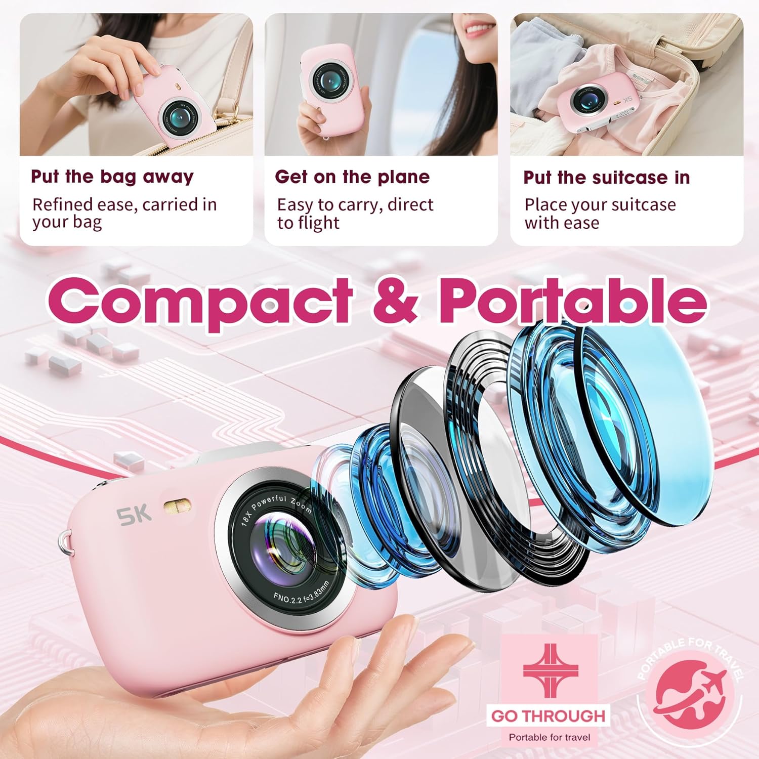 【Upgraded 5K Digital camera】Capture stunning 5K videos and 80MP photos with a Sony CMOS sensor. 18X digital zoom brings distant scenes closer. Built-in flash ensures bright shots in low light. Ideal for digital camera for photography beginners and daily use.